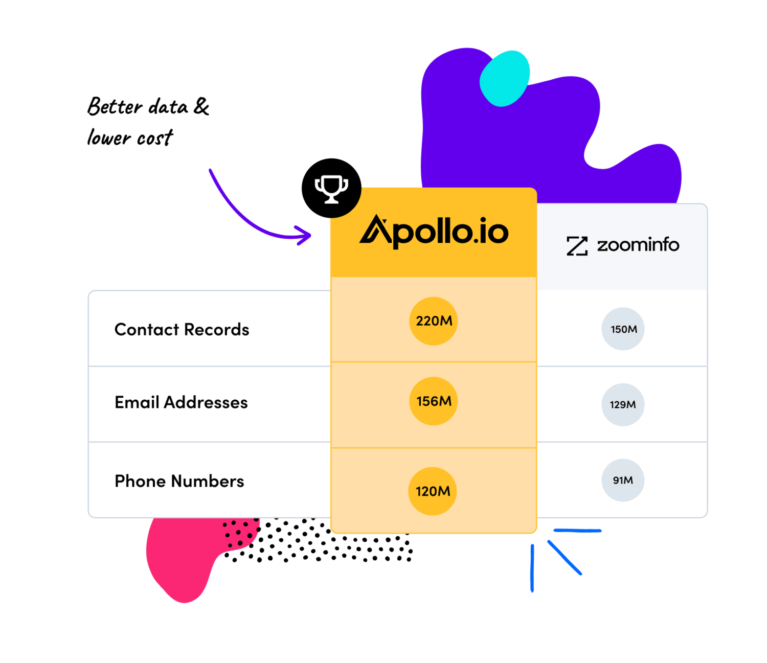 Drive results and hit your numbers faster with Apollo. Compared to every other competitor, Apollo has better data and more tools, all at an affordable price.