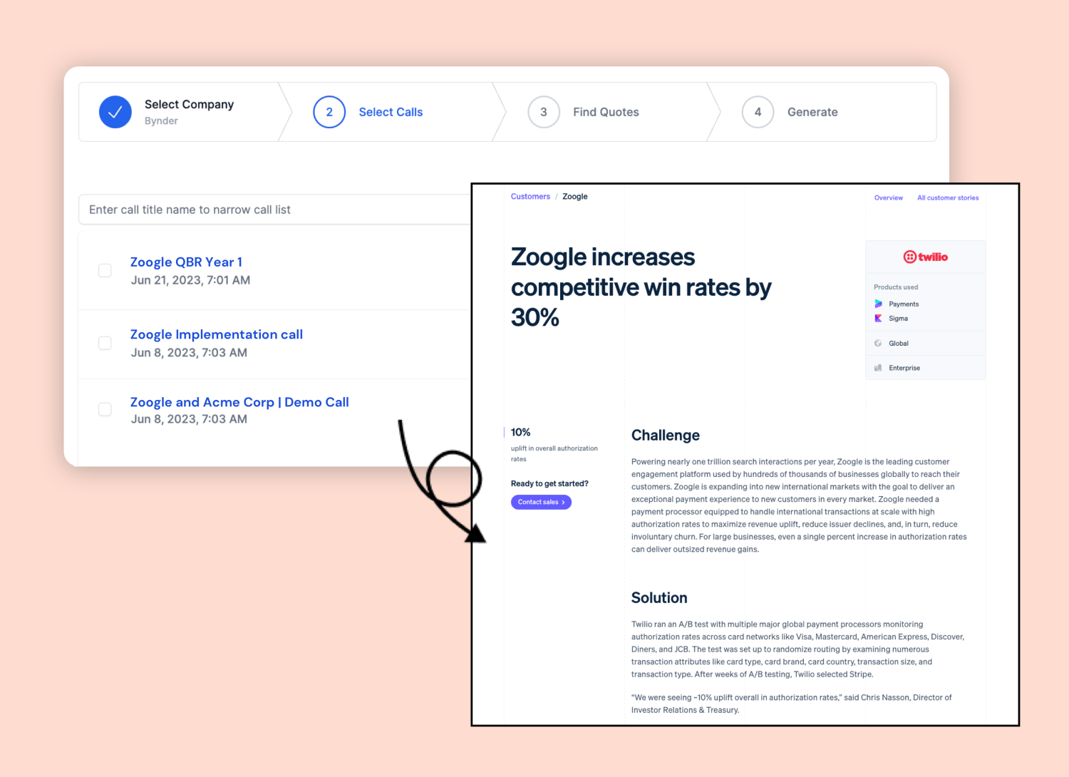 Generate case study assets instantly using call history, cutting effort and time to case study approval by 90%.